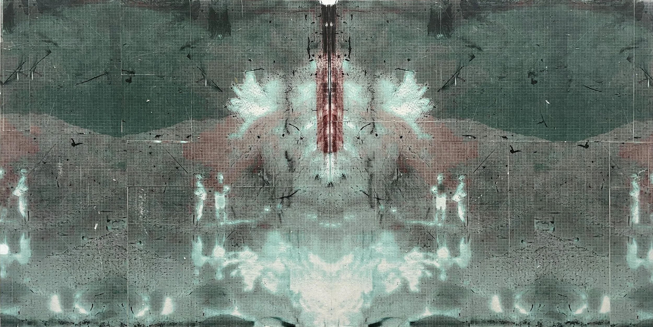 Duology (Call and Response - red/green), 2025, Mixed Media Painting on Wood Panel; 30 x 60 inches