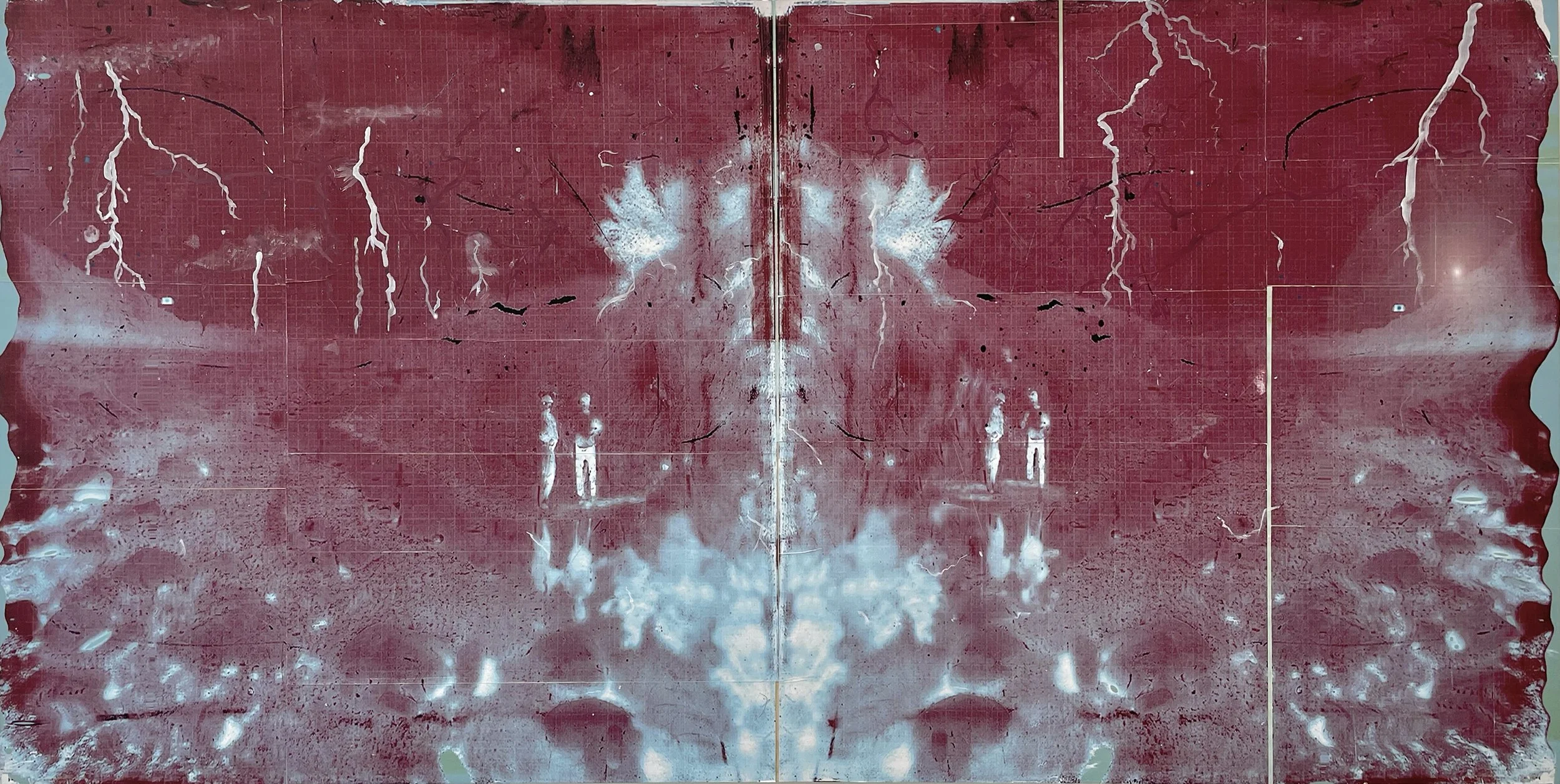 Duology (Call and Response - red), 2025, Mixed Media Painting on Wood Panel; 30 x 60 inches