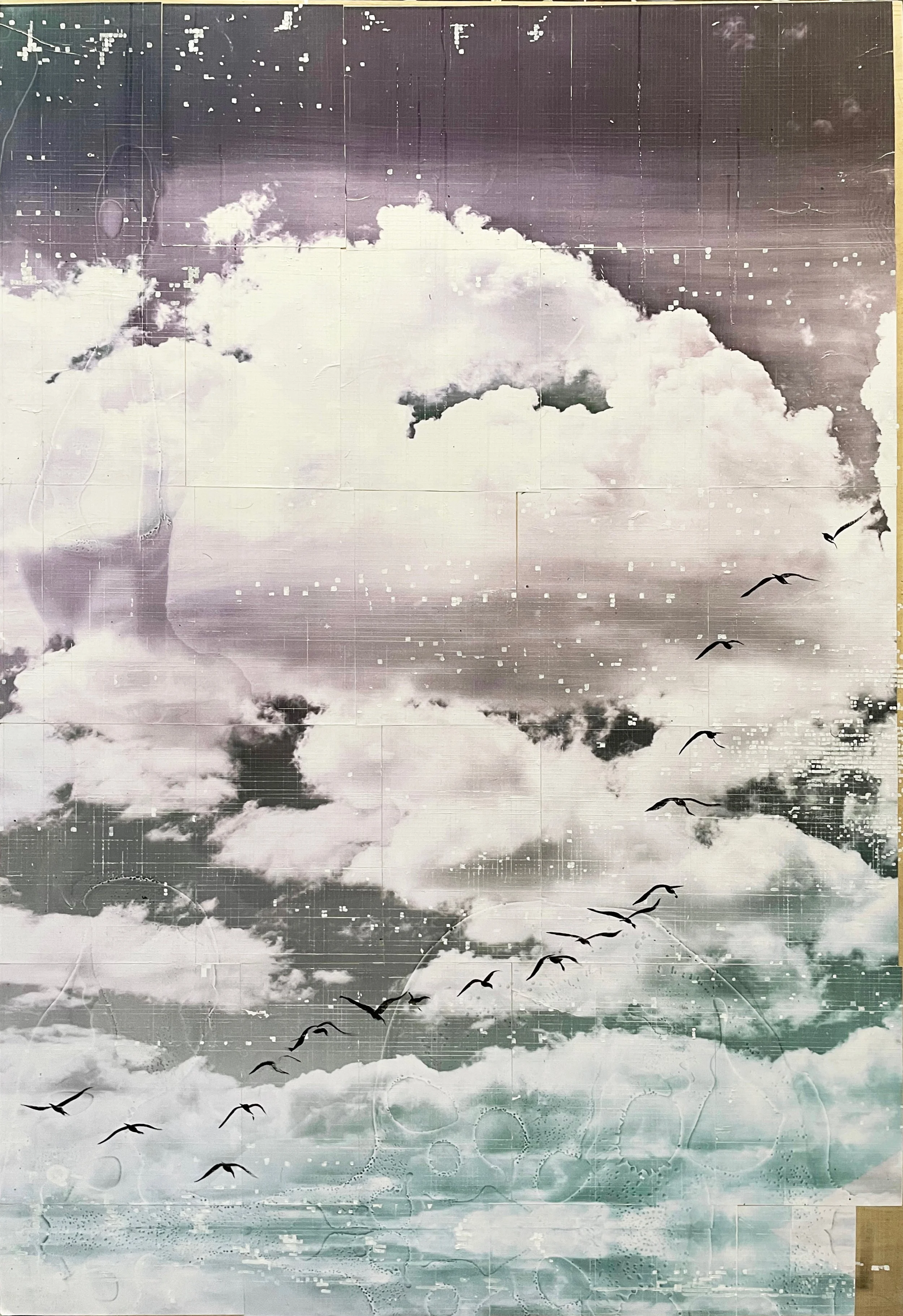 Cubic Birds: Migration I, 2024, Mixed Media Painting on wood Panel, 30 x 40 inches